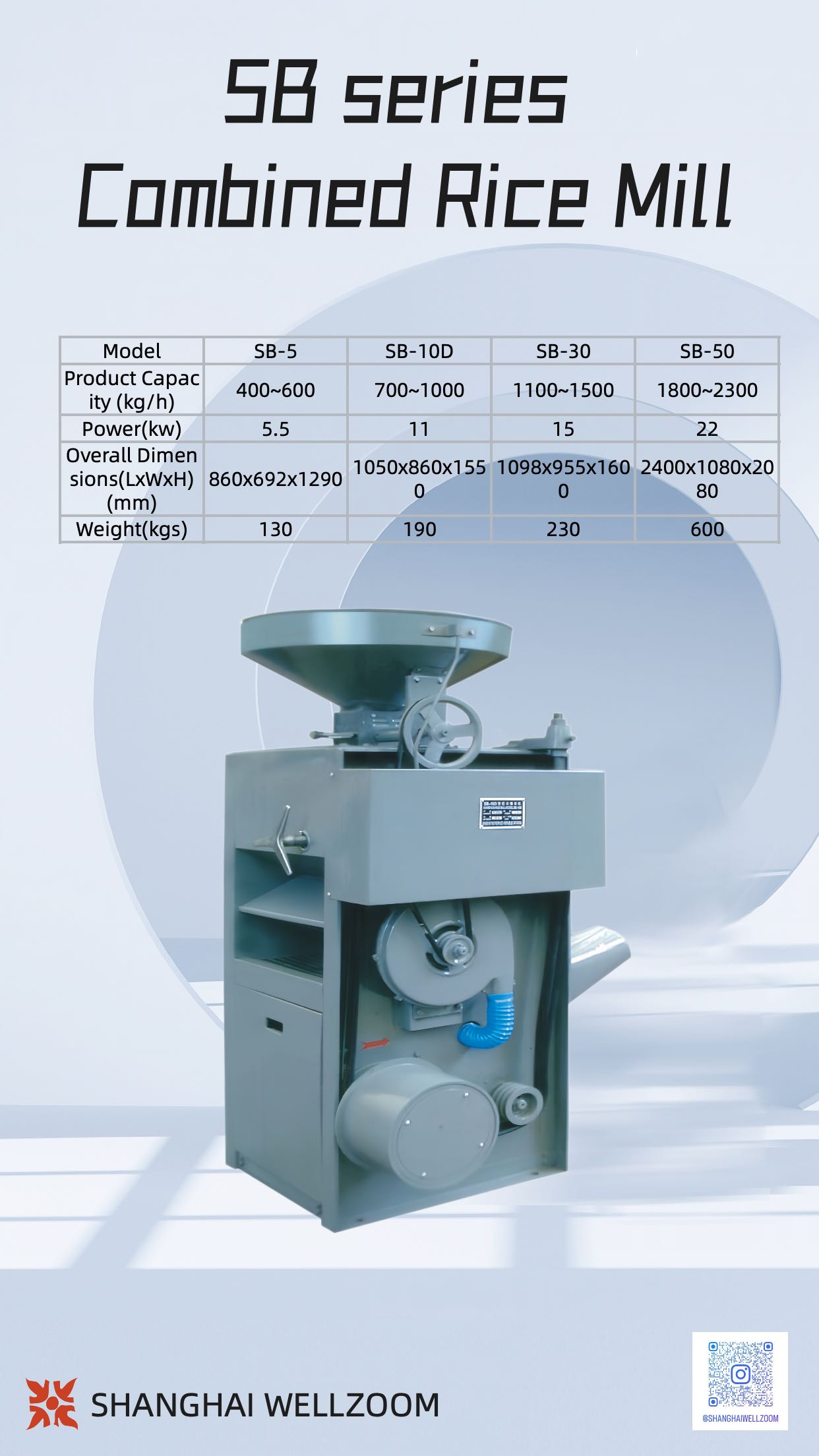SB series combined rice mill can complete the operation from cleaning, hulling, polishing to discharging the husks out of the mill.